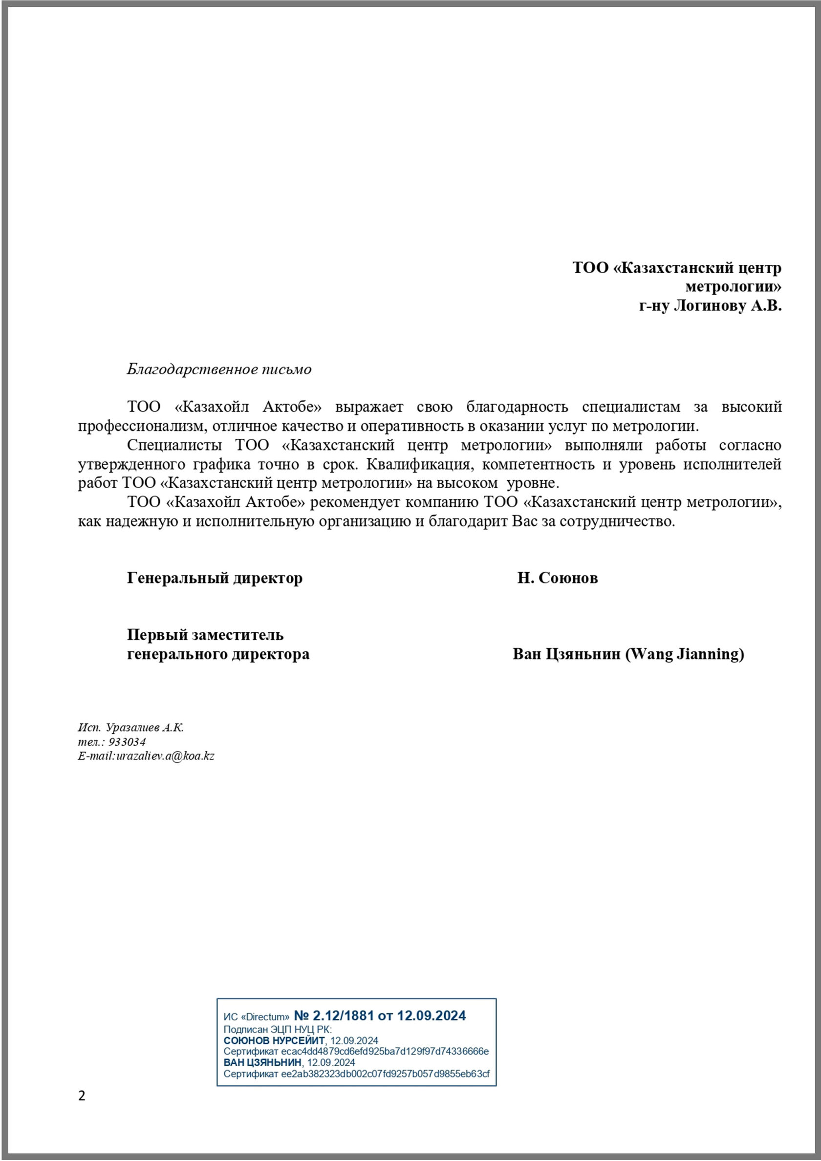 Kazakhoil Aktobe LLP recommends Kazakhstan Metrology Center LLP as a reliable and efficient organization and thanks for cooperation.